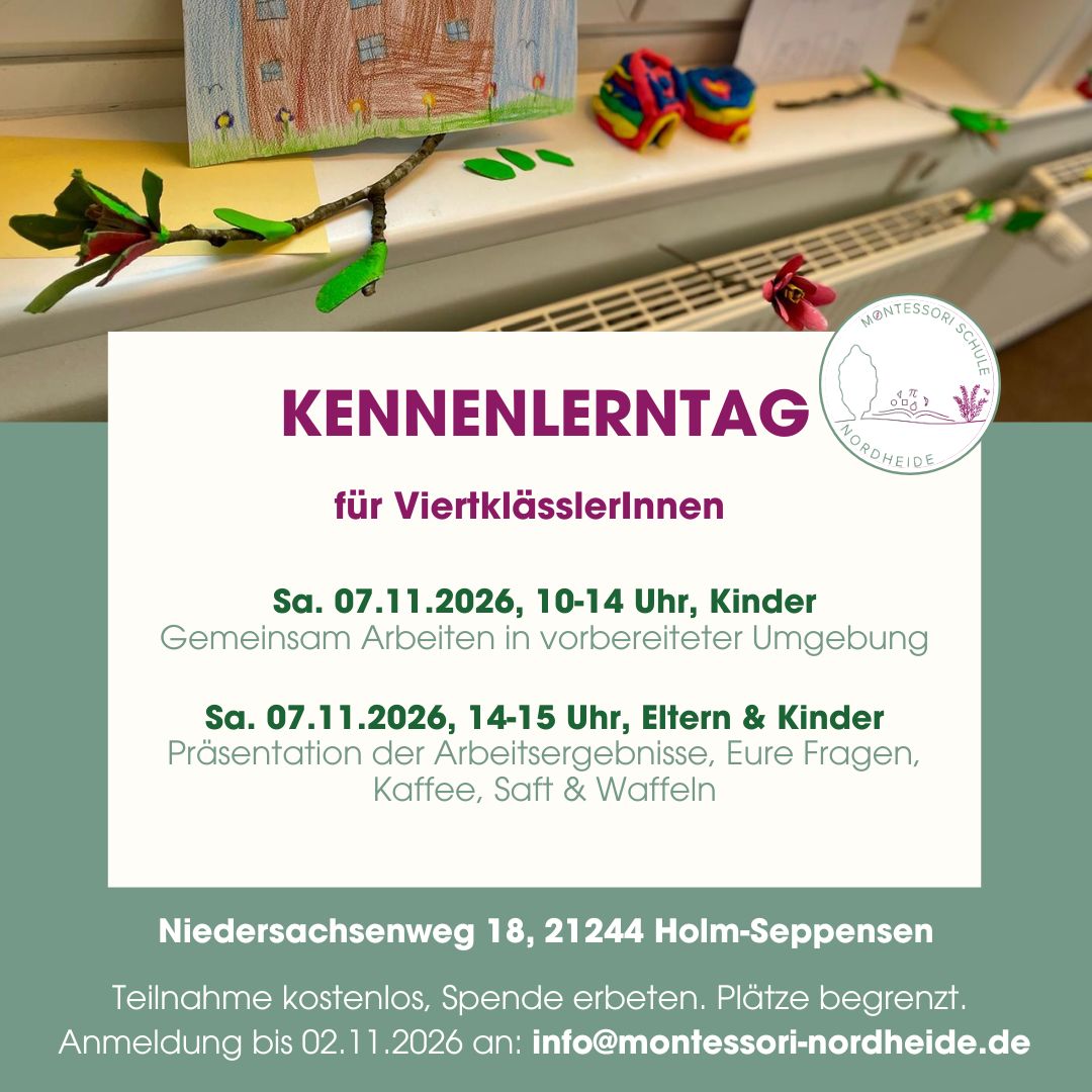 Für ViertklässlerInnen, Eltern und andere Interessierte: Am Samstag, 07.11.2026 findet unser Kennenlerntag für zukünftige Fünftklässlerinnen und Fünftklässler statt. 10-14 Uhr, nur Kinder: Arbeit in der Vorbereiteten Umgebung Die Kinder lernen und forschen gemeinsam, arbeiten mit Montessori-Materialien und erleben unsere vorbereitete Umgebung ganz konkret. 14-15 Uhr, Kinder, Eltern, alle: gemeinsamer Abschluss bei Kaffee, Saft und Waffeln Kinder, Eltern, Interessierte und Team kommen bei Kaffee, Saft und Waffeln zusammen. Die Kinder stellen ihre Arbeitsergebnisse vor und das Schulleitungsteam beantwortet offene Fragen, zum Beispiel zum Konzept oder zum Anmeldeprozess Wir treffen uns in den Räumlichkeiten des ehemaligen Café Kühn in Holm-Seppensen, Niedersachsenweg 18, 21244 Buchholz. Wir bitten um eine Anmeldung bis 02.11.2026 an info@montessori-nordheide.de und freuen uns auf Euch!